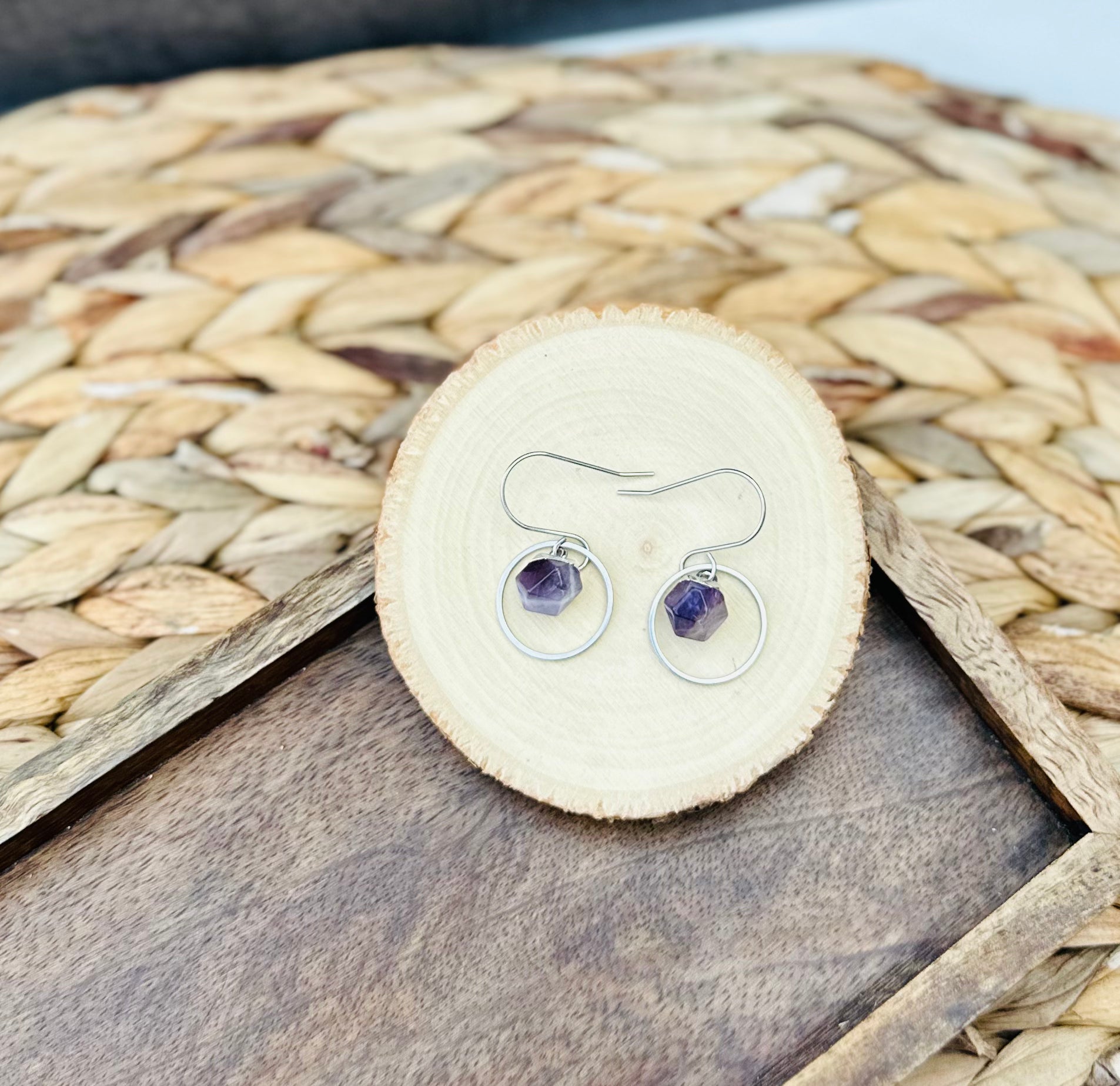 Adorn your ears with our exquisite Silver Amethyst Stone Hoops. These petite 1 inch stainless steel hoops are adorned with a faceted amethyst stone charm, adding a touch of elegance to any outfit. With durable stainless steel ear wires, these hoops are perfect for everyday wear. Elevate your style with these luxurious and exclusive hoops.