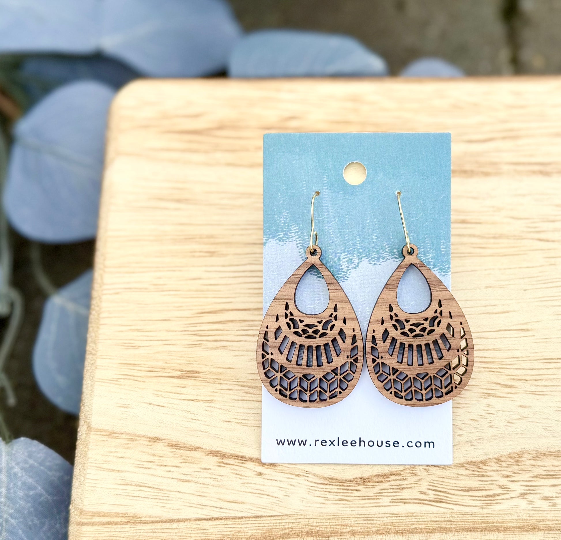 Playful boho vibes meet modern design in these charming teardrop cutout earrings. Laser-cut from lightweight cherry or walnut wood, they're comfortable enough to wear all day without the weight. Choose your perfect finish with silver or gold stainless steel hardware that won't tarnish. At 1.75 inches, they hang just right for a statement that doesn't overwhelm. Perfect for adding a touch of natural, artisanal flair to any outfit.